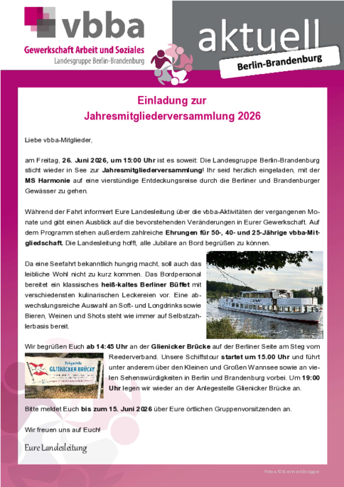 Mit der Teilnahme an „One Billion Rising 2026“ in Oranienburg unterstreiche die vbba Landesgruppe Berlin-Brandenburg ihre klare Haltung: „Keine Toleranz gegenüber Gewalt an Frauen – weder im privaten Umfeld noch im öffentlichen Raum oder am Arbeitsplatz.“ Gemeinsam habe man ein starkes Zeichen gesetzt für Respekt, Gleichstellung und Sicherheit.